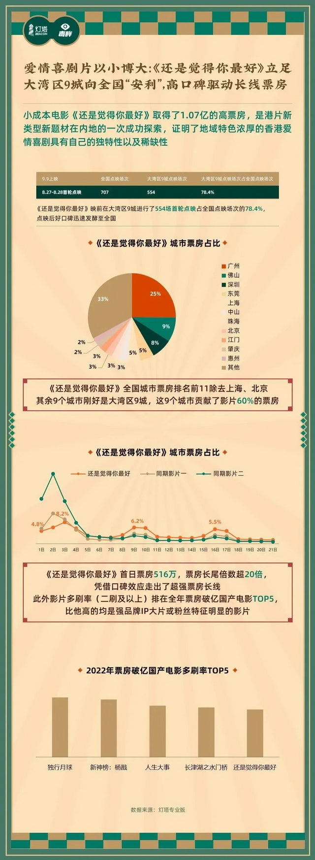 而广东省作为国内最大的票仓所在,已经连续21年稳坐全国省份票房榜冠军,是粤港澳地区的“电影重镇”。灯塔数据显示,2022年广东省总票房37.9亿,占中国电影市场总票房的12.7%,广东省内进入粤港澳大湾区的9个城市又贡献了广东总票房的8成以上。