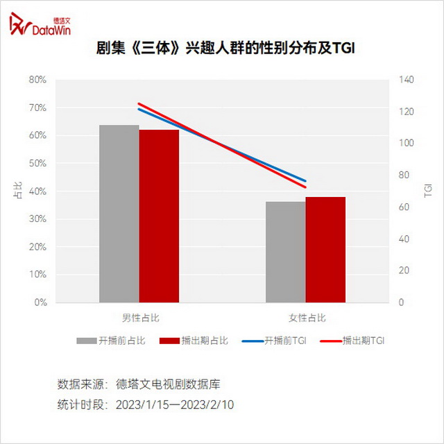 《三体》对于剧集市场和平台会员扩充增量受众,具有十分关键的意义。特别在视频平台会员达到亿级之后,由于原本基本盘足够大,剧集寻找到增量用户也变得更加困难。据云合报告,2022年腾讯视频上新独播剧用户的平均年龄在30.4岁,女性占比为66%。而《三体》显然在突破原本的圈层。根据德塔文数据显示,《三体》的兴趣人群在初期主要落点于18-30岁以内的男性人群,播出后24-30岁人群的兴趣意愿大幅提升,男女差异占比有所缩减,女性观众的兴趣意愿增加,总体呈现出城市化、青年轻熟、男女皆宜的特点。