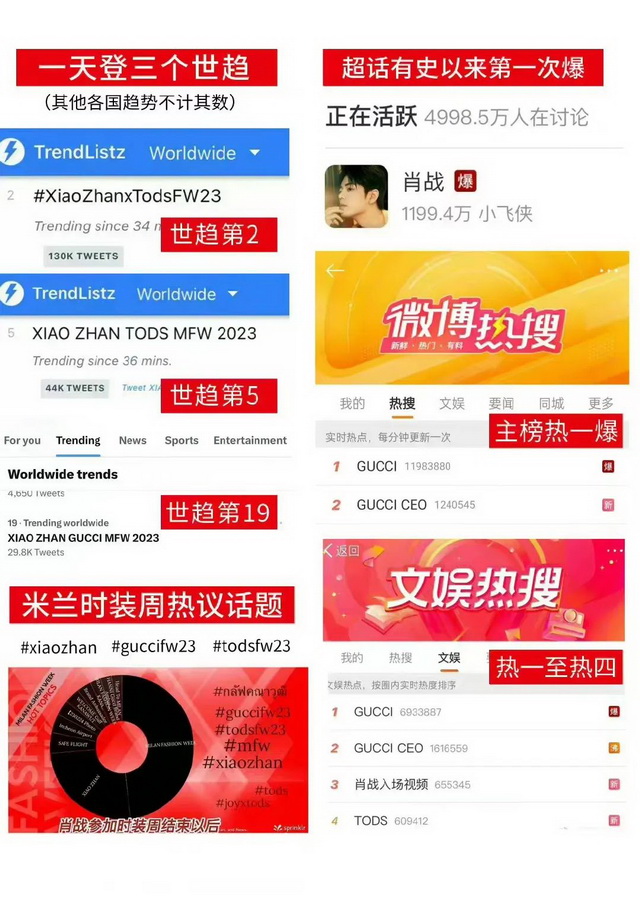 同样地,因为国内众多网友和媒体对肖战相关看秀内容的讨论,也在一定程度上促使品牌热度大幅度提升,一度使GUCCI登上微博热搜榜第一位,TOD'S登上微博热搜榜第四,这种不是因为品牌有负面而登上微博热搜榜高位且引起巨大讨论热潮的现象极其少见。