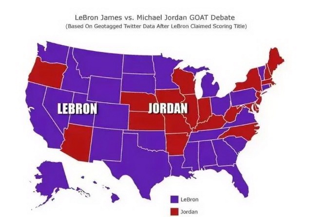 随后,外媒ESPN制作的一张庆贺图片被詹姆斯本人转发,图中詹姆斯端坐王座举起双臂,迈克尔·乔丹、科比·布莱恩特、卡尔·马龙、贾巴尔四位球星立于阶梯之下。其本意只是说明“得分王”易主,但构图上的强烈对比还是被球迷广泛解读。