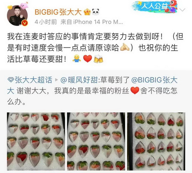 而且他的人脉确实给观众带来了收益。对于杨幂、黄明昊等艺人的粉丝来说,正主微博不营业,但张大大对发合照自拍有求必应,反而多了看到偶像的机会。他这次直播的“许愿”主题,也能活用他的人脉资源,帮张碧晨粉丝发语音,承诺要送TFBOYS十周年演唱会门票——在切实的利益面前,过去那些并不实质性的“黑料”,自然显得无关紧要了。