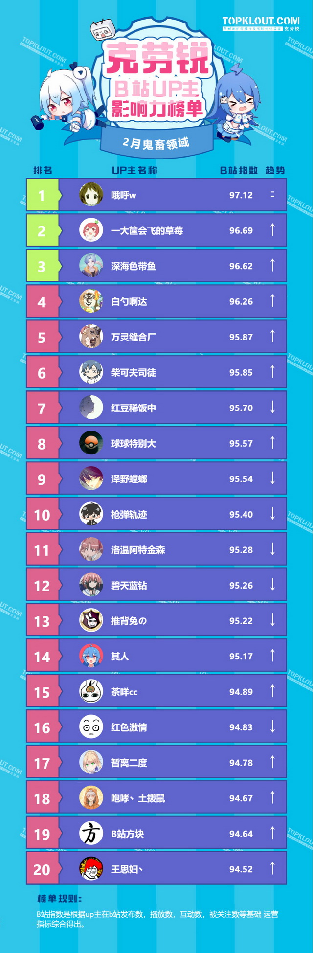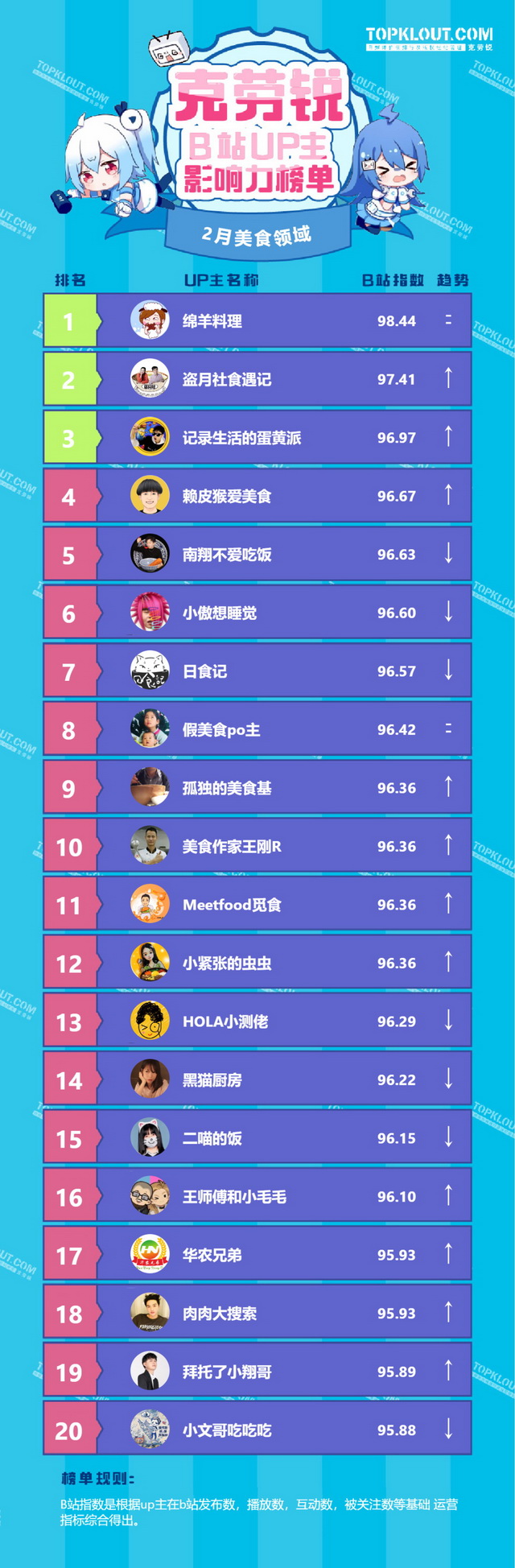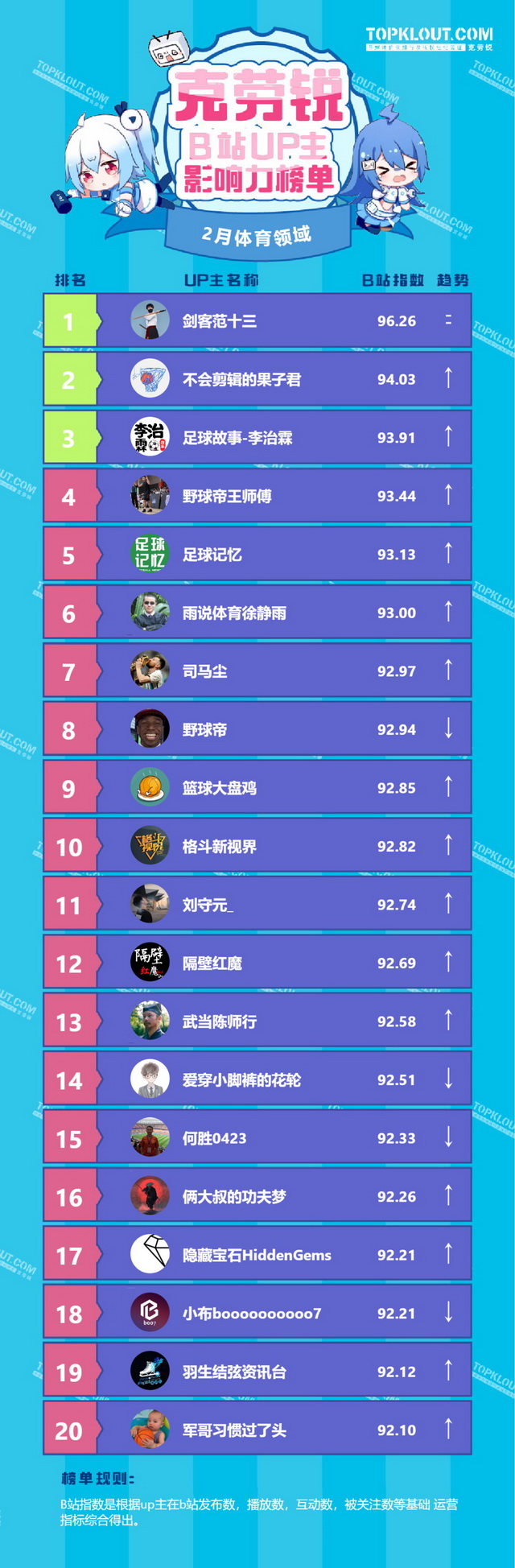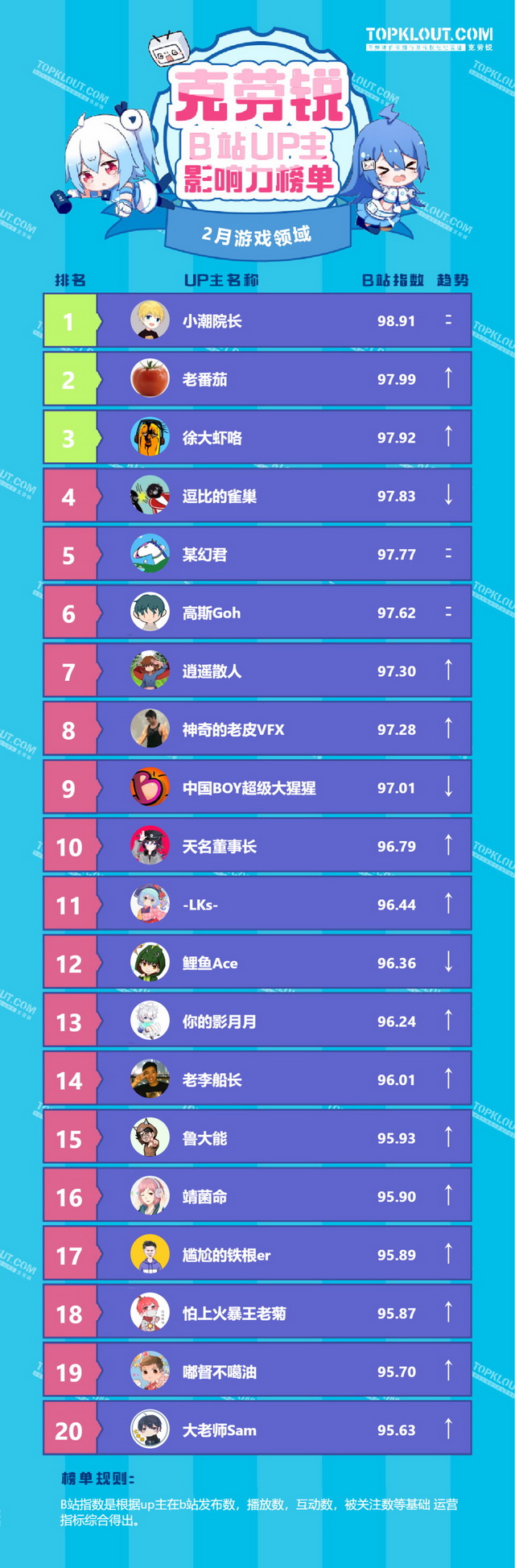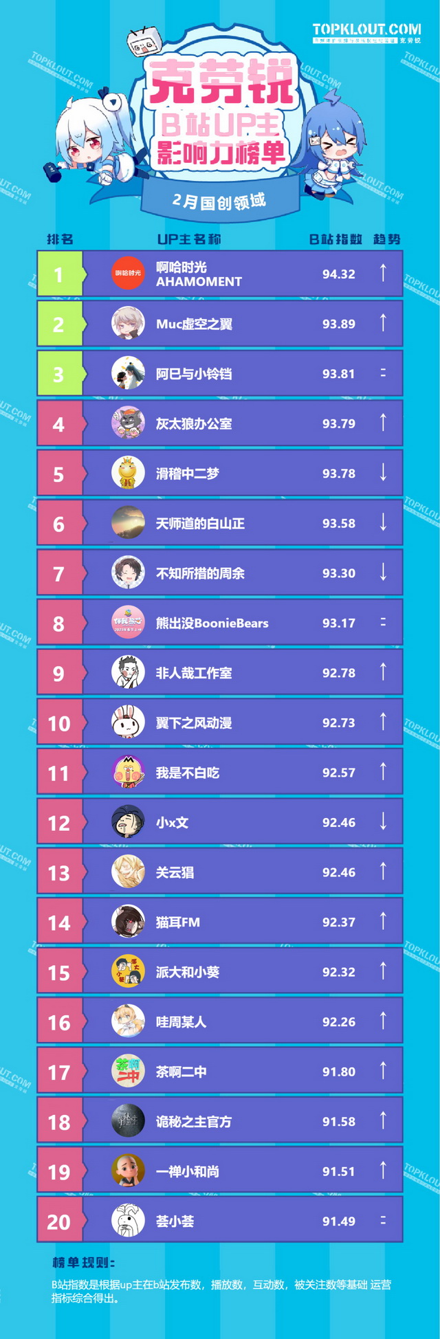 各垂类头部UP主排名依据的是“B站指数”。B站指数是根据每位UP主的内容发布量、播放量、转发量、评论量、收藏量、点赞量、关注量共七个维度综合计算得出的,是客观反映UP主的影响力及营销价值的重要指标。我们来一起看看2月榜单吧!