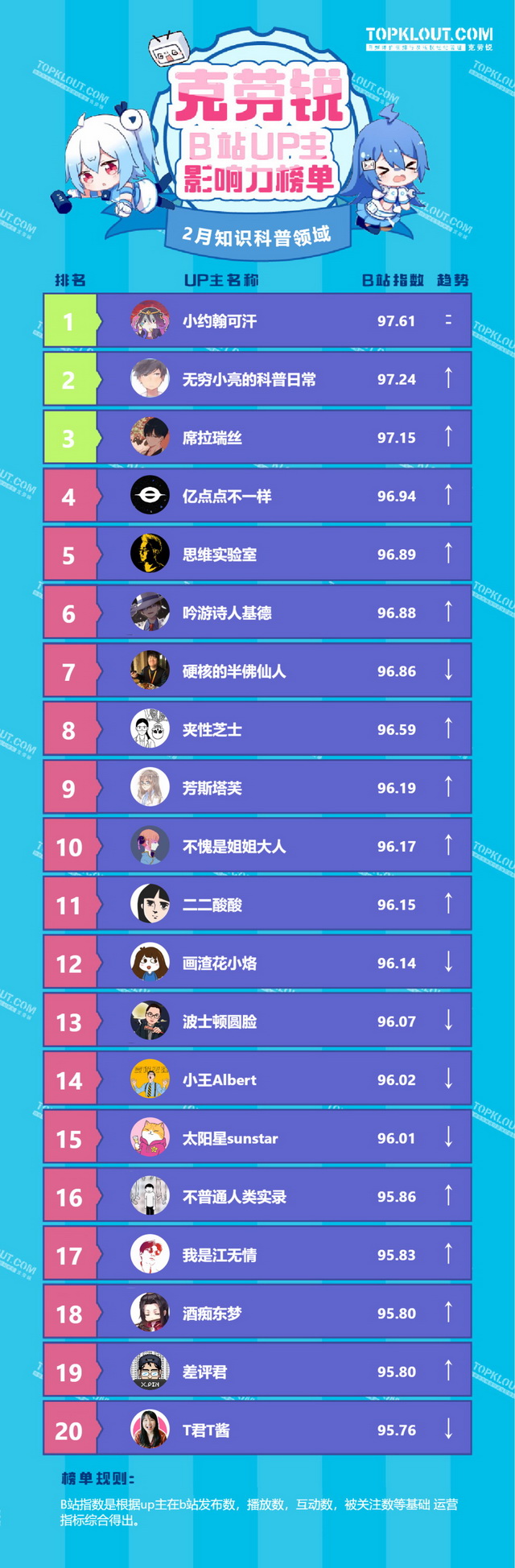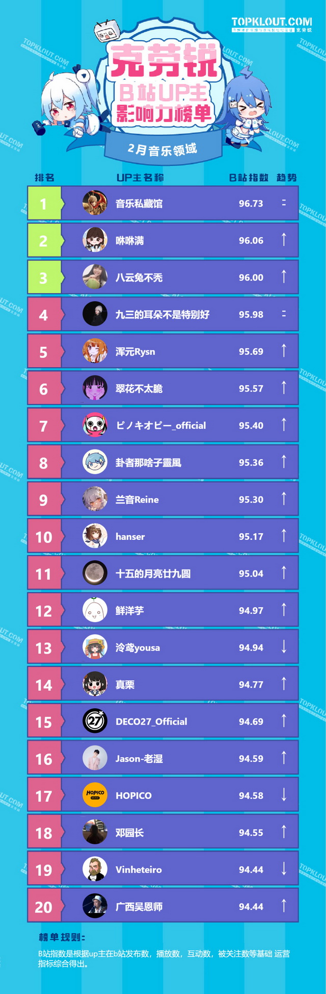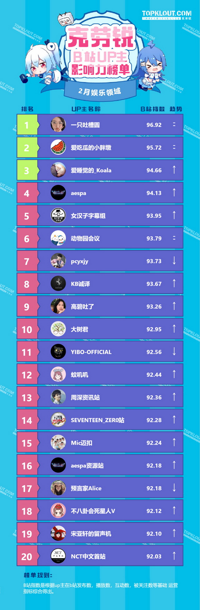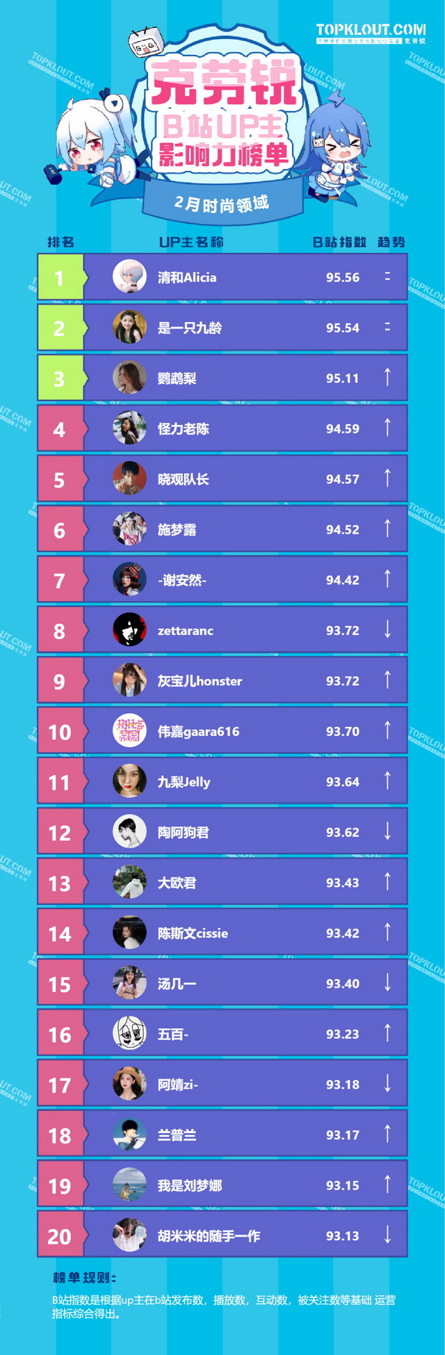 各垂类头部UP主排名依据的是“B站指数”。B站指数是根据每位UP主的内容发布量、播放量、转发量、评论量、收藏量、点赞量、关注量共七个维度综合计算得出的,是客观反映UP主的影响力及营销价值的重要指标。我们来一起看看2月榜单吧!