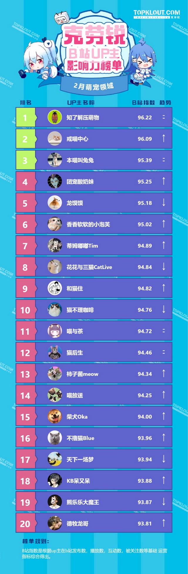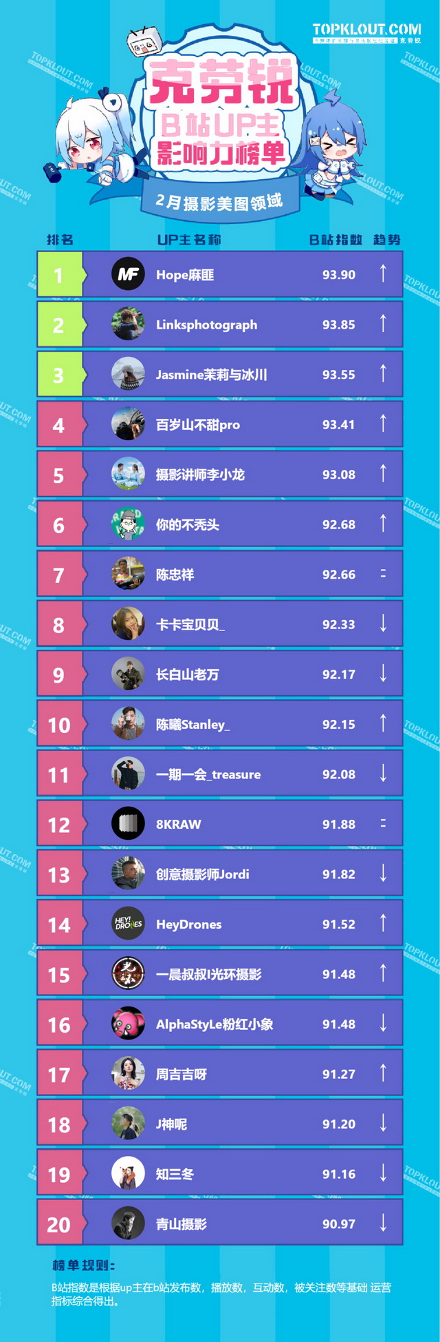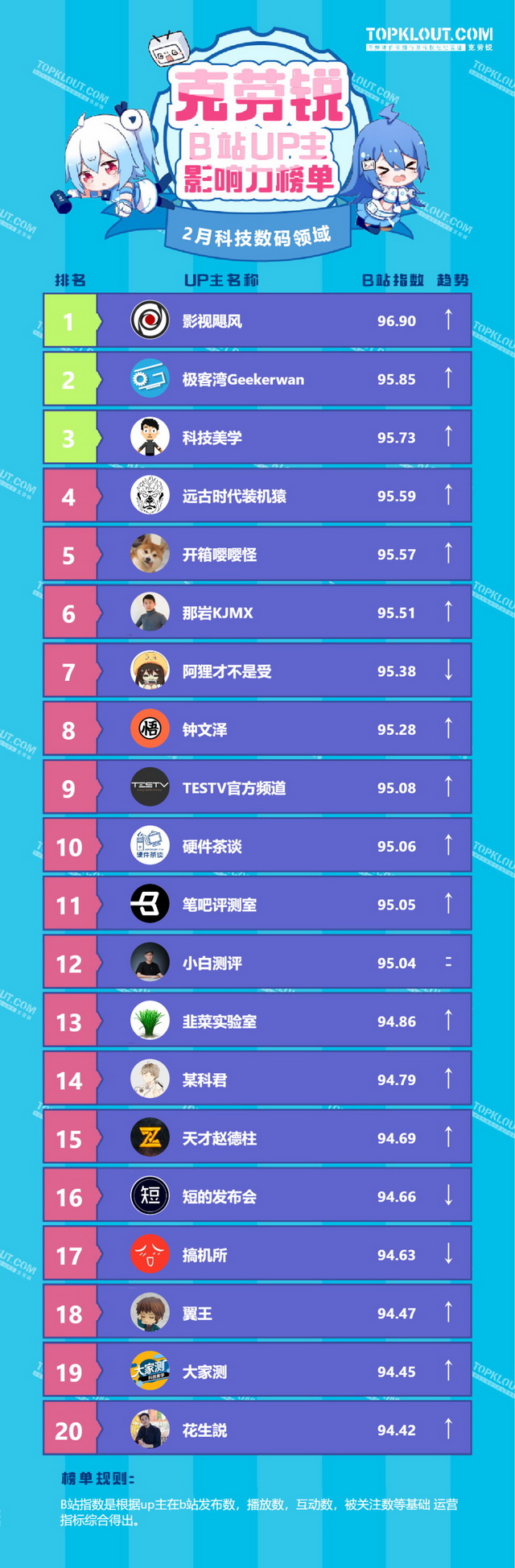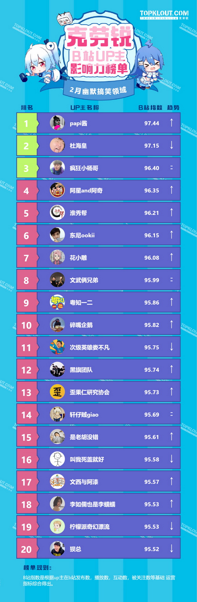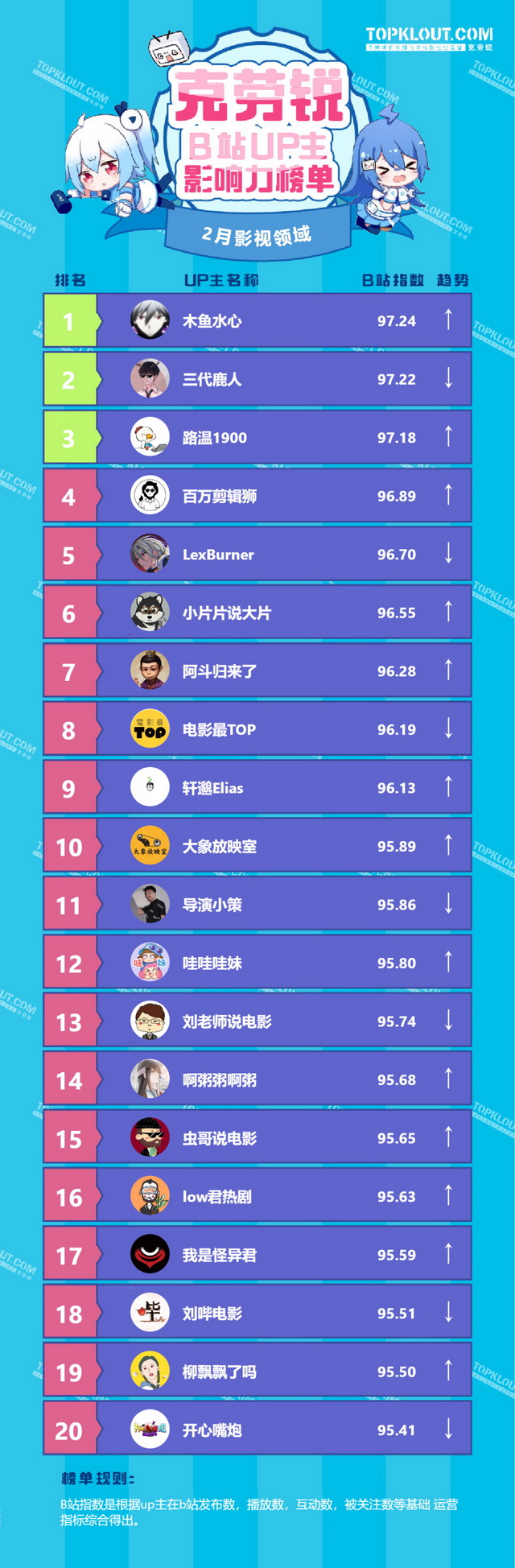 各垂类头部UP主排名依据的是“B站指数”。B站指数是根据每位UP主的内容发布量、播放量、转发量、评论量、收藏量、点赞量、关注量共七个维度综合计算得出的,是客观反映UP主的影响力及营销价值的重要指标。我们来一起看看2月榜单吧!