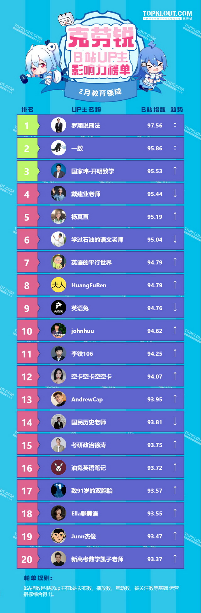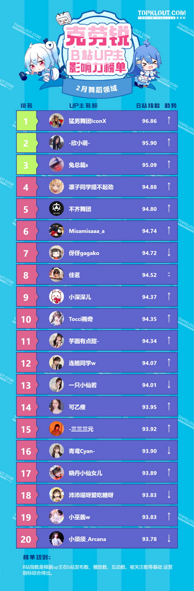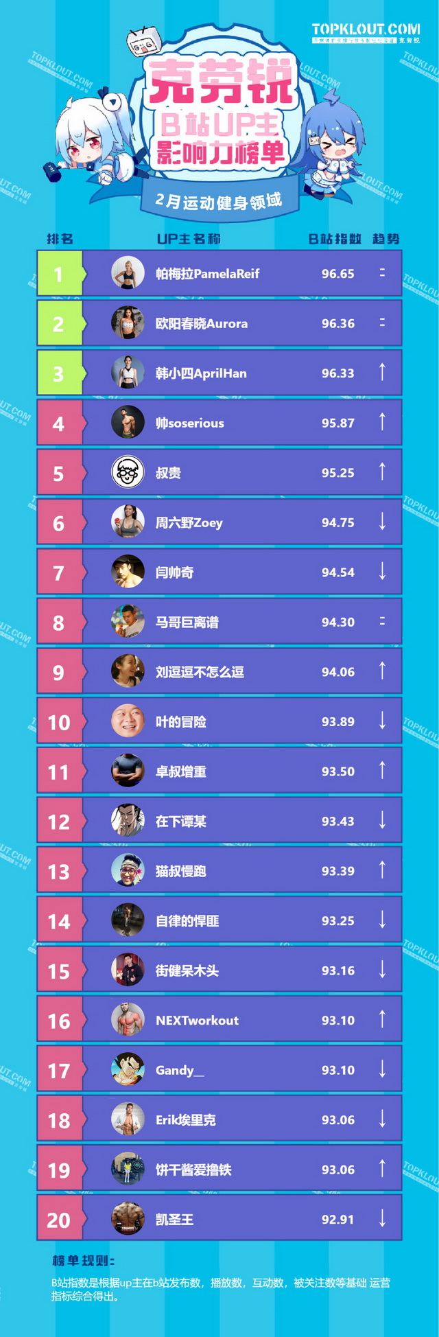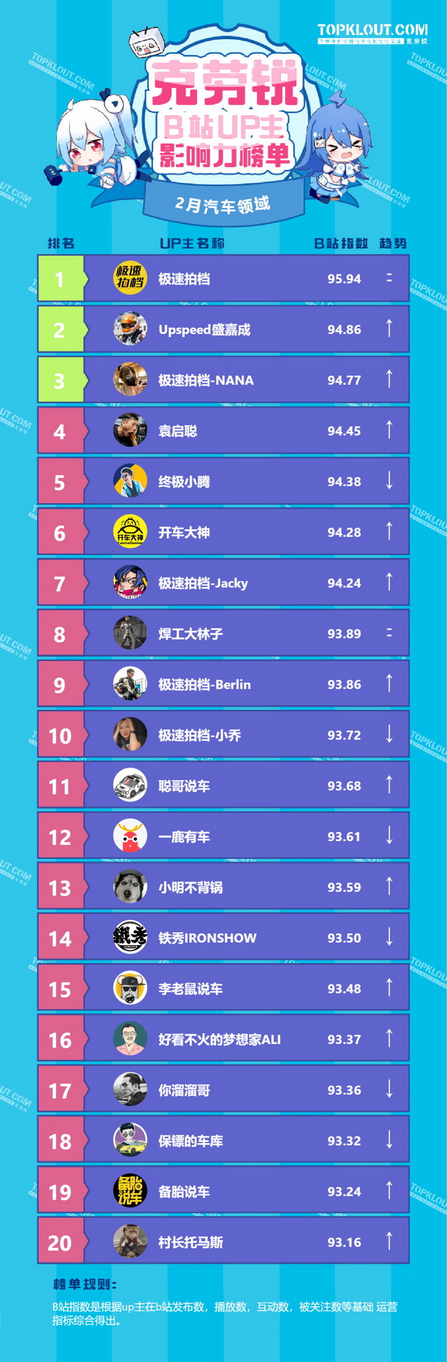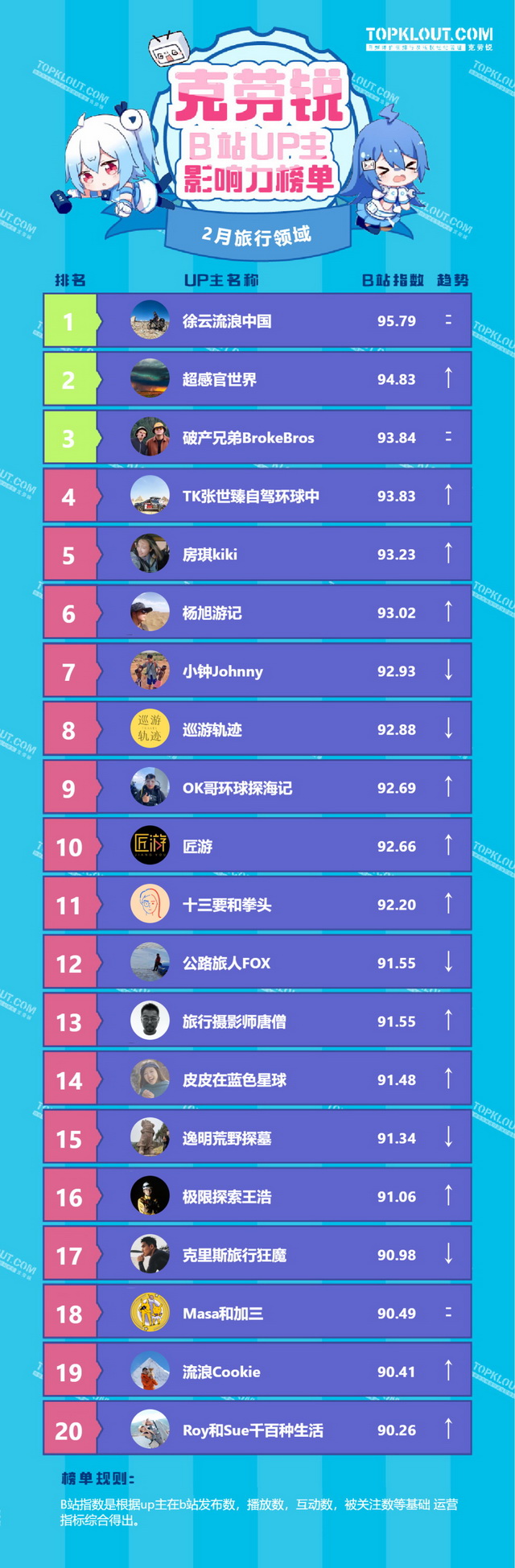 各垂类头部UP主排名依据的是“B站指数”。B站指数是根据每位UP主的内容发布量、播放量、转发量、评论量、收藏量、点赞量、关注量共七个维度综合计算得出的,是客观反映UP主的影响力及营销价值的重要指标。我们来一起看看2月榜单吧!