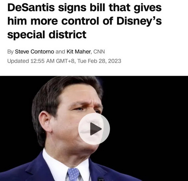当地时间2月27日,佛罗里达州长罗恩·德桑蒂斯正式签署法案,剥夺华特·迪士尼世界原本享有的“自治权”,并成立新的五人董事会来控制该主题乐园所在地区的公共服务,令这场迪士尼因抗议涉同性恋法律而延烧的争端持续成为焦点。
