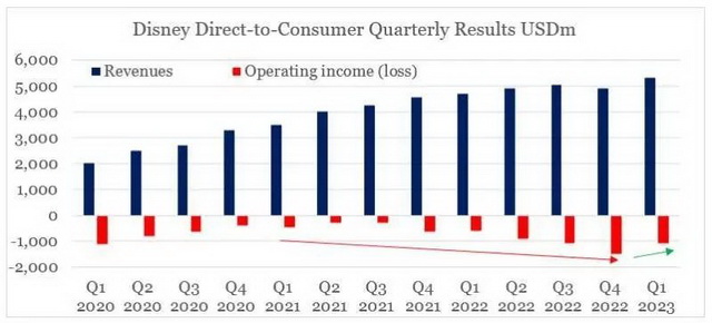 这一下行趋势也体现在直接面向消费者的财务指标上:该版块的季度营收为53.07亿美元,同比前一年的46.90亿美元提升13%;但亏损额也从5.93亿美元扩大至10.53亿美元,同比暴增78%。综合2022年各份季报披露的数据,直接面向消费者版块在12个月内便净亏44.75亿美元,持续加码的流媒体投资对迪士尼的财务压力可见一斑。