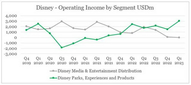 再加上包含ABC频道等传统电视资产的有线网络版块遭遇营收和利润双降,迪士尼媒体和娱乐发行部门的季度收入仅增长1%,且从前一年8.08亿美元的盈利转为亏损1千万美元。反倒是聚焦线下的公园、体验和产品部门持续反弹,当季营收提升21%至87.36亿美元,同时维持30.53亿美元的运营利润,对迪士尼的整体业绩形成支撑。