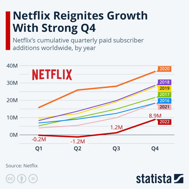相比之下,流媒体龙头Netflix的财报则显露出更为乐观的基调:1月19日,Netflix在给投资者的信件中披露,截至去年底平台总订阅数达到2.3075亿,单季新增766万用户,远高于450万的预期值。在2022上半年经历连续两个季度的负增长后,Netflix在下半年合计吸引1007万新订户,重新回到良性成长的轨道中。