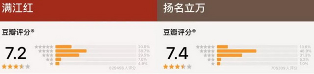 《满江红》与《扬名立万》尽管在票房上均为成功作品,但口碑层面却有差距。《满江红》从豆瓣开分时的8.0一路跌到了现在的7.2,从评分占比中也能看出,五星和二星以下的占比都比《扬名立万》要更高,口碑两极分化严重。