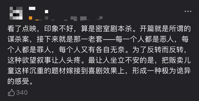 但复合类型又对剧作提出了更高的要求。比如市场反馈不佳的《不速来客》,有豆瓣短评就提到,“把贩卖儿童这样沉重的题材嫁接到喜剧效果上,形成一种极为诡异的感受。”