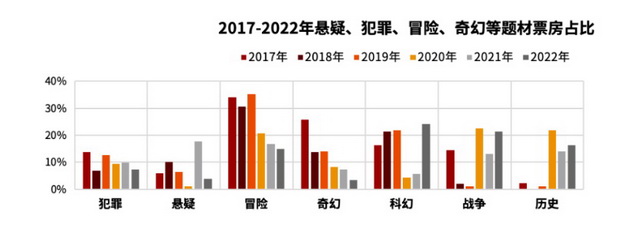 尽管单片的成功难以预料,盲目跟风也并不理智,但在金金看来,目前国内电影市场中悬疑类型片整体的供给还是不够的,想要有精品出现,先要形成蔚然成风的创作氛围。据猫眼《2022中国电影市场数据洞察》,2017-2022年,悬疑类型影片的票房占比除2021年一枝独秀之外,持续处于10%之下。