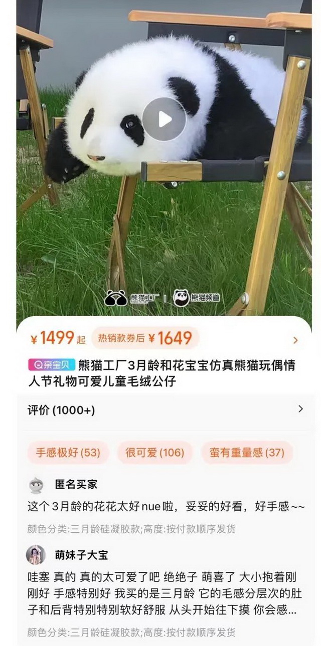 购买周边也是熊猫粉们表达自身喜爱和支持的重要举措。在淘宝上,和花周边的销量增长了906%,一只仿真熊猫玩偶售价为1649元,购买人数超过一千人。