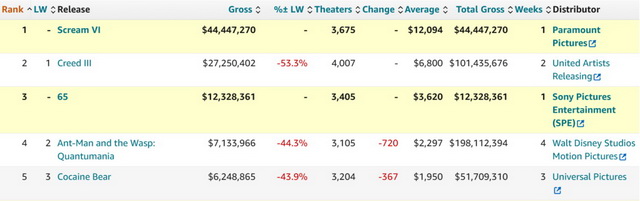 据The-Numbers统计,《惊声尖叫6》在提前场便进账570万美元,在近两年的恐怖片中仅次于《不》(640万美元)。随后《惊声尖叫6》铺开至北美3675家影院,周五含零点共拿下1929万美元,击败《奎迪3》夺得单日冠军;接下来两天《惊声尖叫6》环比下滑20和37%,周末票房最终报收于4445万美元,单馆收益达到1.2万美元。