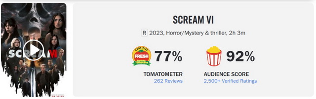 2022年1月,《惊声尖叫5》在零点场于3千家影院进帐350万美元,随后扩大至3664家影院并在首周末突破3千万美元,最终北美续航至8164万美元,全球则累计到1.39亿美元。据披露《惊声尖叫5》的制作成本为2400万美元,由此片商的投资回报比达到5.8倍。值得一提的是,《惊声尖叫5》的烂蕃茄新鲜度达到76%,为第二部以来口碑最高的作品。