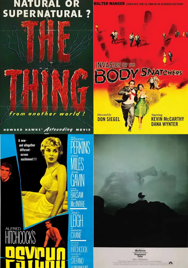 二战后受到核威胁、美苏太空争霸等大背景影响,恐怖开始和科幻结合,恐怖的来源开始以外星人、植物、昆虫等为主,如霍华德·霍克斯的《魔星下凡》、唐·席格的《天外魔花》等。到60年代,就开始有一些著名大导演让恐怖电影摆脱对超自然的兴趣,转而用人的精神变态来吓人,追求心理恐怖而非视觉恐怖,如希区柯克的《惊魂记》、波兰斯基的《罗斯玛丽的婴儿》等。