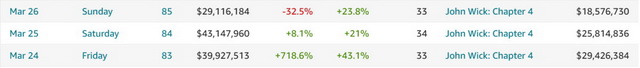 在强劲需求的驱动下,《疾速追杀4》在首日含零点共拿到2943万美元,拉抬北美大盘环比急升逾718%;接下来两天《疾速追杀4》分别下滑12%和28%,周末票房报收于7382万美元,单馆收益达到1.91万美元。