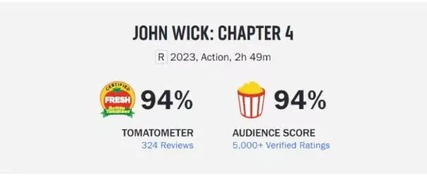 从口碑来看,《疾速追杀4》获得媒体和观众的一致推崇,不仅烂番茄新鲜度飙升至95%,比前作的89%进一步提升,同时爆米花指数也达到95%,与IMDb上的8.4分(5万个评价)相呼应。
