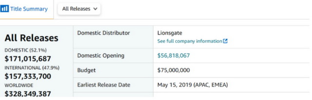这一成绩超过《疾速追杀3》(5682万美元)创下系列新高,也成为自2015年的《饥饿游戏:自由幻梦最终章》后,发行方狮门影业的最佳开画数字。