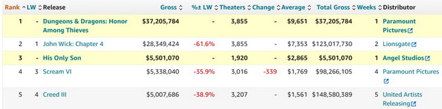 在《龙与地下城》的正向驱动下,北美周末大盘报收于9617万美元,连续第七周位于9千万美元以上;由此3月总收益升至6.35亿美元,同比去年提高近8%。纵观第一季度,北美院线共录得17.18亿美元的产出,较2022年前三个月增长近28%。
