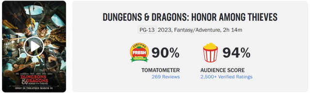 从口碑来看,《龙与地下城》的烂番茄新鲜度达到90%,影评人称赞其在喜剧的外表下“具有坚实的情感核心”,对非游戏粉丝也能提供有趣的幻想和冒险元素;同时,表征观众喜好度的爆米花指数也冲至94%,与IMDb上得到的7.6分(逾2万个评价)相差不大。以此看来,《龙与地下城》的综合风评在同期影片中居前,后续将以北美破亿为先期目标。