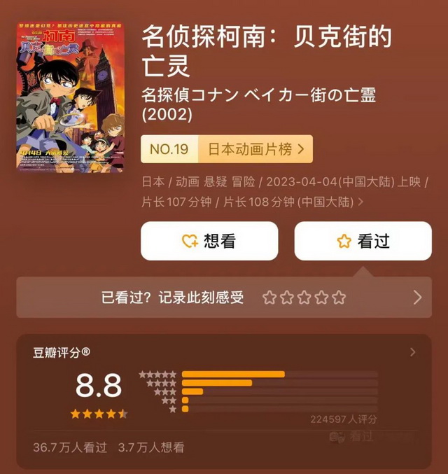 有22万人在豆瓣给这部剧场版打出了8.8的高分,且无论在国内还是日本的评分网站,《贝克街的亡灵》都是历届剧场版中的最高分,被视作《名侦探柯南》历代剧场版的“巅峰之作”。