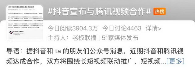 抖音和爱奇艺的合作,标志着长短视频在走过漫长的拉锯战后进入了融合阶段,今日官宣的抖音和腾讯视频的牵手,再次证明了这一点。在解决了最棘手的版权问题之后,依托巨大的流量池和日渐丰富的明星生态,抖音在文娱内容的营销版图中占据了更重要的位置。