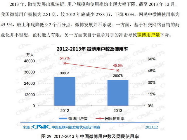 迅速在用户数量上超越微博的微信,是微博的第一个竞争对手。CNNIC第33次《中国互联网络发展状况统计报告》的数据显示,截至2013年12月,我国微博用户规模为2.81亿,较2012年底减少2783万,下降9.0%。
