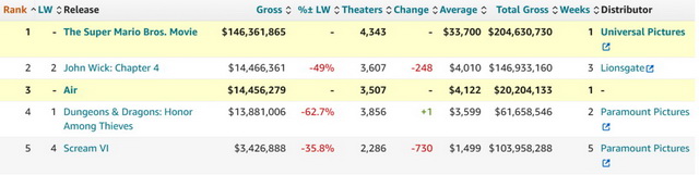 《马力欧》率先进驻4025家影院,在5日便进账3170万美元,在周三开画总榜上位居第8名;随后《马力欧》再拿下2657万美元,为周四次日的历年第二高成绩。进入周末,《马力欧》旋即扩映至4343家影院,仅比《蚁人与黄蜂女:量子狂潮》少2家。