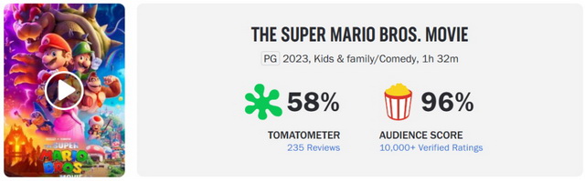不过《马力欧》的口碑呈两极分化态势,汇集主流媒体意见的烂番茄新鲜度低至58%,影评人对其单薄的剧情设定颇有微词;但这并未影响观众高涨的热情,爆米花指数飙升到96%,在近期新片中与《奎迪3》持平。结合CinemaScore上的A和IMDb用户打出的7.4分,可见《马力欧》在粉丝中的看法相当正面,在一定程度上对冲了负评的不利影响。