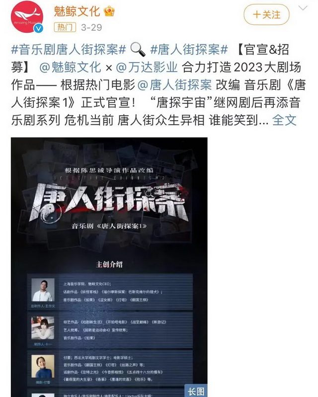 入局者还在增多。3月29日,音乐剧出品公司上海魅鲸文化公开招募音乐剧《唐人街探案》的演员。后来者消息一个个传来,但缪时客和长信传媒都对毒眸(ID:Domoredumou)说,这场生意不是零和博弈,他们更希望,有更多后来者可以一起入场,“把音乐剧这块蛋糕做大。”