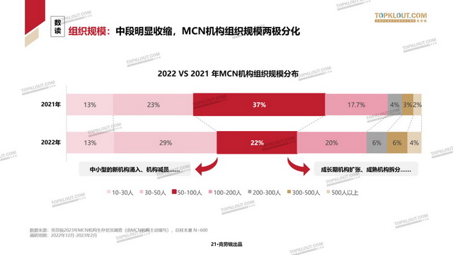 根据克劳锐的调研数据显示,MCN机构组织“中段(50-100人规模)”明显收缩,占比从37%降至22%。MCN机构组织规模两极分化,一面是中小型的新机构涌入、机构减员,另一面是成长期机构扩张、成熟机构拆分。