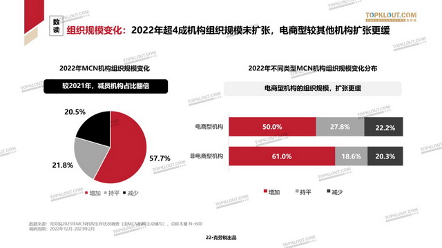 在“降本”方面,与2021年相比,2022年4成机构组织规模未扩张,电商型机构较其他机构扩张更缓;较2021年,减员机构占比翻倍。成立3年以上机构团队增长快,百人规模仍是机构扩张的分水岭。