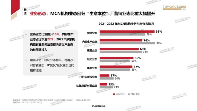在“增效”方面,2022年MCN机构业态回归“生意本位”,营销业态比重大幅提升。据克劳锐调研数据显示,2022年,机构仍聚焦在内容生产业态、营销业态、运营业态三大业态,其中营销业态比重提升16%,电商业态、经纪业态持平,社群/知识付费业态、IP授权/版权业态占比缩减。