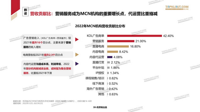 据克劳锐调研MCN机构发现,2022年营销服务成为各MCN机构的重要增长点,代运营比重缩减。整体上看,KOL广告商单占MCN机构营销贡献比超40%,直播电商占比16.8%。