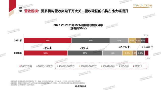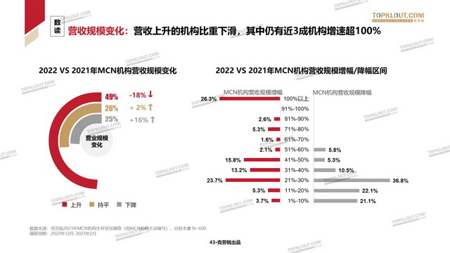 从营收大盘看,虽然更多MCN机构营收突破千万大关,营收破亿的机构占比大幅提升,比例从6.2%升至9.6%,但营收上升的机构比重下滑,下滑机构占整体比重较2021下滑18%。