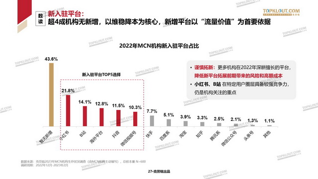 从数据上看,超4成机构无新增平台,MCN机构以维稳降本为核心目标,新增平台基本以“流量价值”为首要依据。更多机构选择在2022年深耕擅长的平台,降低新平台拓展前期带来的风险和高额成本。