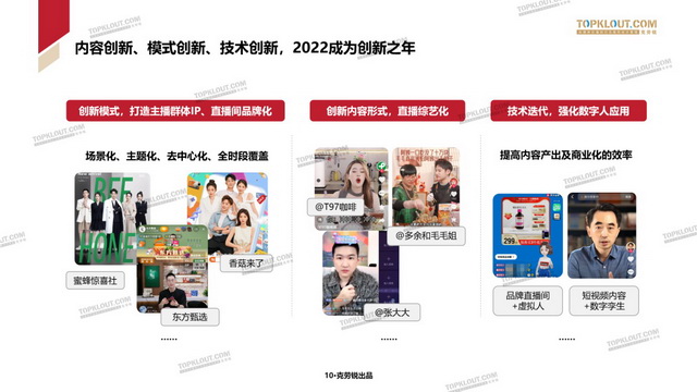 各种创新性的直播形式层出不穷,喊麦、角色扮演等形式使得带货直播更具娱乐性与观赏性,直播正在朝着综艺化的方向发展。此外,技术迭代,强化了数字人在内容行业的应用,提高内容产出及商业化的效率。