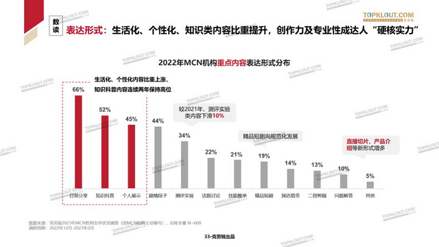 最后,通过数据分析MCN机构重点内容表达形式分布可得,2022年生活化、个性化、知识类内容比重提升,知识科普内容连续两年保持高位,创作力及专业性成达人“硬核实力”。