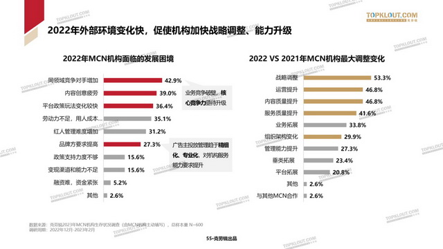 根据克劳锐的洞察,整个2022年上下游诉求升级、同行业竞争加剧、机构盈利难度攀升。在“降本增效”的大背景下,“求增长”成为各MCN机构的重点战略,商业夯实团队、提高效率成为机构最主要的行动措施。