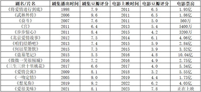 即便这些电影作品的主演和主创团队均与剧集不同,但由于大部分情况下采用的都是流量演员,来自主演阵容变化的负面影响可以降到最低。随着流媒体平台对电视台在播出渠道上的替代趋势逐渐显现,这一时期的大热剧集相对于上一个时期也呈现出更圈层化的特征,也即意味着IP核心受众为电影买单的概率更高。