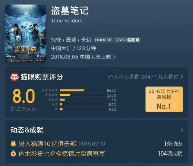 从上述表格不难看出,自《何以笙萧默》开始,剧改影作品的整体票房水平,明显提升了一个档次,但口碑却整体下滑了一个档次。《盗墓笔记》超10亿的票房成绩,更是被业界视作电影市场进入“IP+流量”时代的起点。