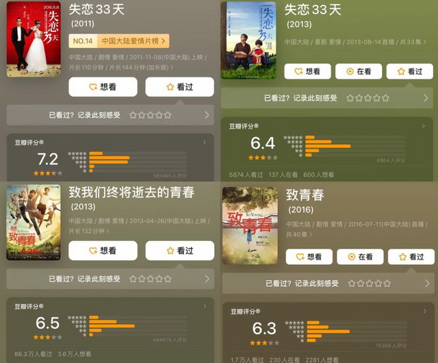 另一方面,首因效应的作用,也让观众容易对所见的第一版故事有更深的滤镜。相对来说,改编之后的作品无论做多大程度的改动,都很难打破前作的好印象,更不用说实现自我超越。在影改剧的作品中,诸如《失恋33天》《致青春》等,改编之后的剧版评分亦不如影版。