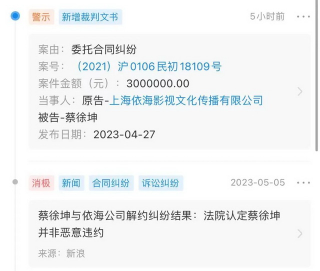据企查查APP显示,近日,上海依海影视文化传播有限公司与蔡徐坤委托合同纠纷一审民事判决书公布。最终,法院认定蔡徐坤“并非恶意违约”,对于解约赔偿金,法院酌情确定为300万元,驳回原告其他请求。