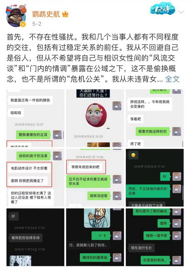 五一期间,不同女性在微博指控史航对自身包括但不限于言语骚扰、肢体接触等不同类型的性骚扰行为,这些指控逐渐被更多疑似受害者响应;在持续数日的沉默后,史航发布微博反驳称不存在性骚扰,和几位当事人“都有不同程度的交往”,且相关内容为“风流交谈”。