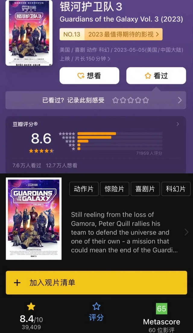 豆瓣开分8.6、IMDB 8.4,在经历了整个第四阶段的持续低迷、第五阶段《黑豹2》《蚁人3》同样的开局不利之后,《银河护卫队3》非但没有延续颓势,反而捅破了漫威的口碑天花板——即便是大名鼎鼎的《复仇者联盟4》在豆瓣也仅仅8.5分,在IMDB与它持平。