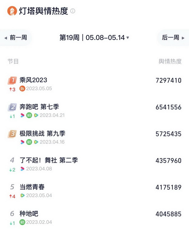 观众仍然热爱讨论这档综艺:灯塔专业版显示,《乘风2023》(以下简称“浪姐4”)登顶上周舆情热度周榜,大大小小的热搜话题覆盖了龚琳娜美依礼芽的《花海》舞台、徐怀钰划水以及谢娜组票数争议,甚至你能在热搜上看到完整的故事线,从发生再到投票观众的解释,都可以登上热搜。