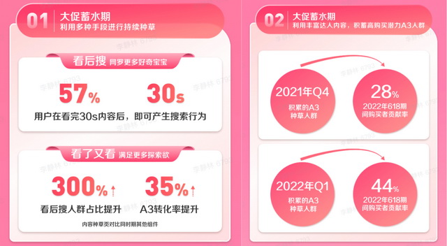 其次,大促蓄水期更重要的一件事是积蓄高购买潜力A3人群,如前文所述,A3种草人群是对品牌内容有多次点击、搜索、加购等主动行为的用户群体,他们往往具备较高的购买潜力。据官方统计数据显示,2021年Q4积累的A3种草人群为2022年618大促带去了28%的贡献率,而2022年Q1积累的A3种草人群为2022年618大促带去了44%的贡献率,A3人群带来的贡献率正在不断上升。