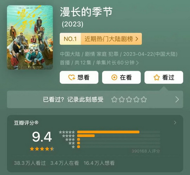 截至毒眸(ID:Domoredumou)发稿前,超38万人为这部剧打出了9.4的高分。会员收官当天,“漫长的季节 封神”登上热搜第一。到现在距离收官一周过去,关于这部剧演员表演细节、剧中前期铺下的伏笔,还一直在被讨论。