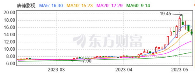 这可让过去跌了六七年的影视公司,多少有些猝不及防。以积压的《巴清传》闻名的唐德影视,公司股票交易价格自2023年4月19日至2023年5月4日连续9个交易日收盘价格涨幅偏离值累计达108.16%,属于严重异常波动的情况。